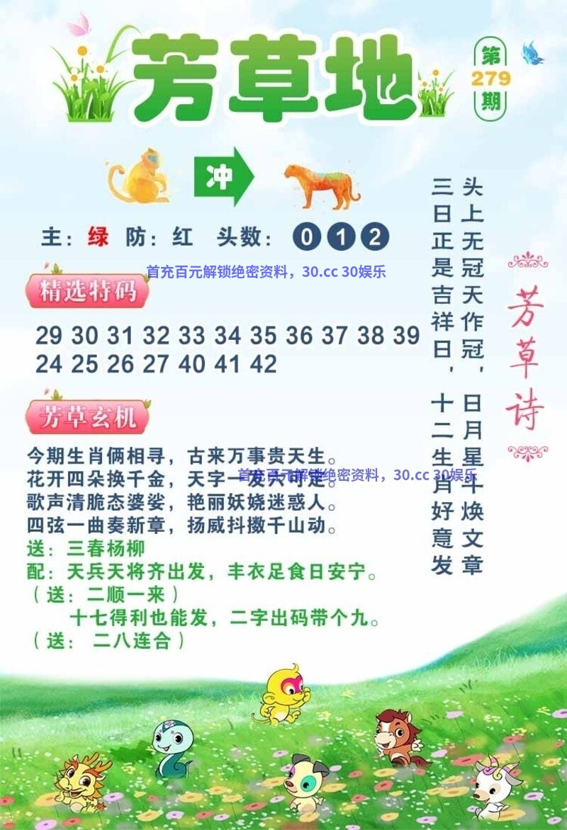 280期芳草玄机一帆风顺蛇虎午,沾亲带故取蓝红。异想天开七月七,数一数二金肖来。狗拿耗子三更天,龙虎争一伴二七。狗撵兔子势凶残,春秋一轮左右开。